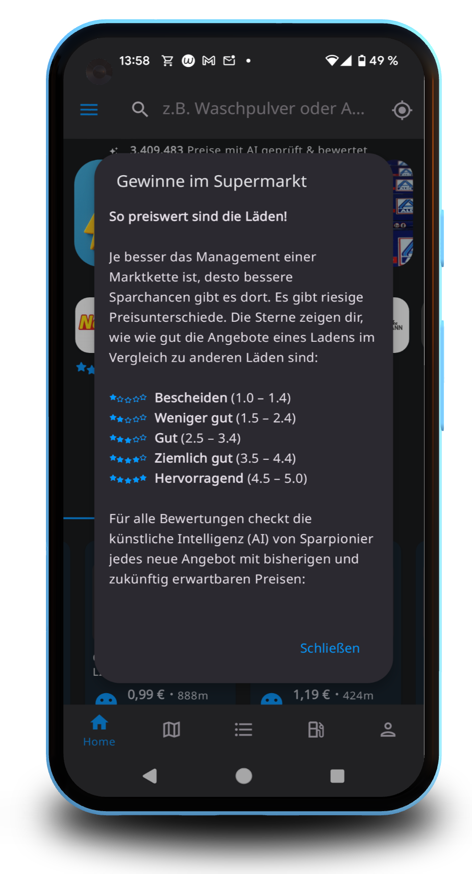 Die Marktbewertung von Sparpionier hilft dir als weitere nützliche Peilmarke bei der Marktauswahl. Oder bei der Kontrolle der Preisentwicklung in deinem Lieblingsladen.