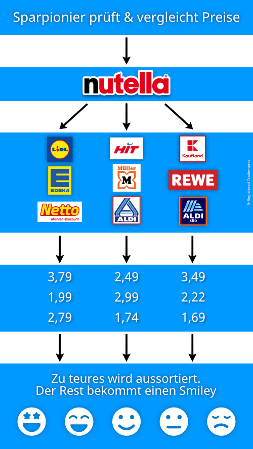 Für die Bewertung prüfen wir jeden Laden über einen Warenkorb der beliebtesten Produkte. Unser Algorithmus bewertet u.a. auch, wie oft und wie lange die Schnäppchen im Laden gelten. Aufgrund unserer jahrelangen Preisforschung haben wir festgestellt, dass es sich mal weniger und mal mehr lohnt, in einem Laden zu kaufen. Je nach Woche oder Tag. Sparpionier AI zeigt dir auf einen Blick, wo man gerade besonders gut sparen kann.